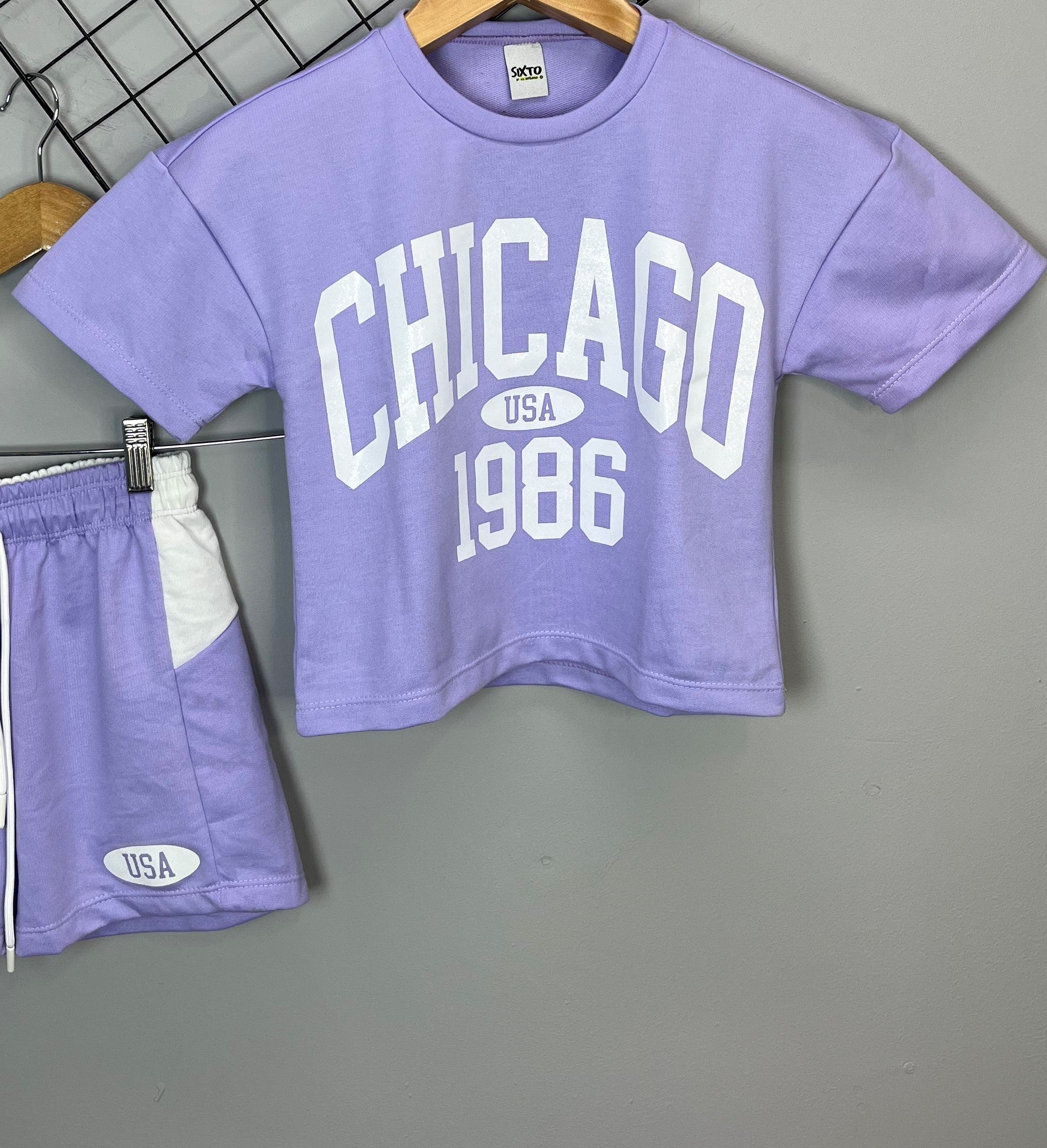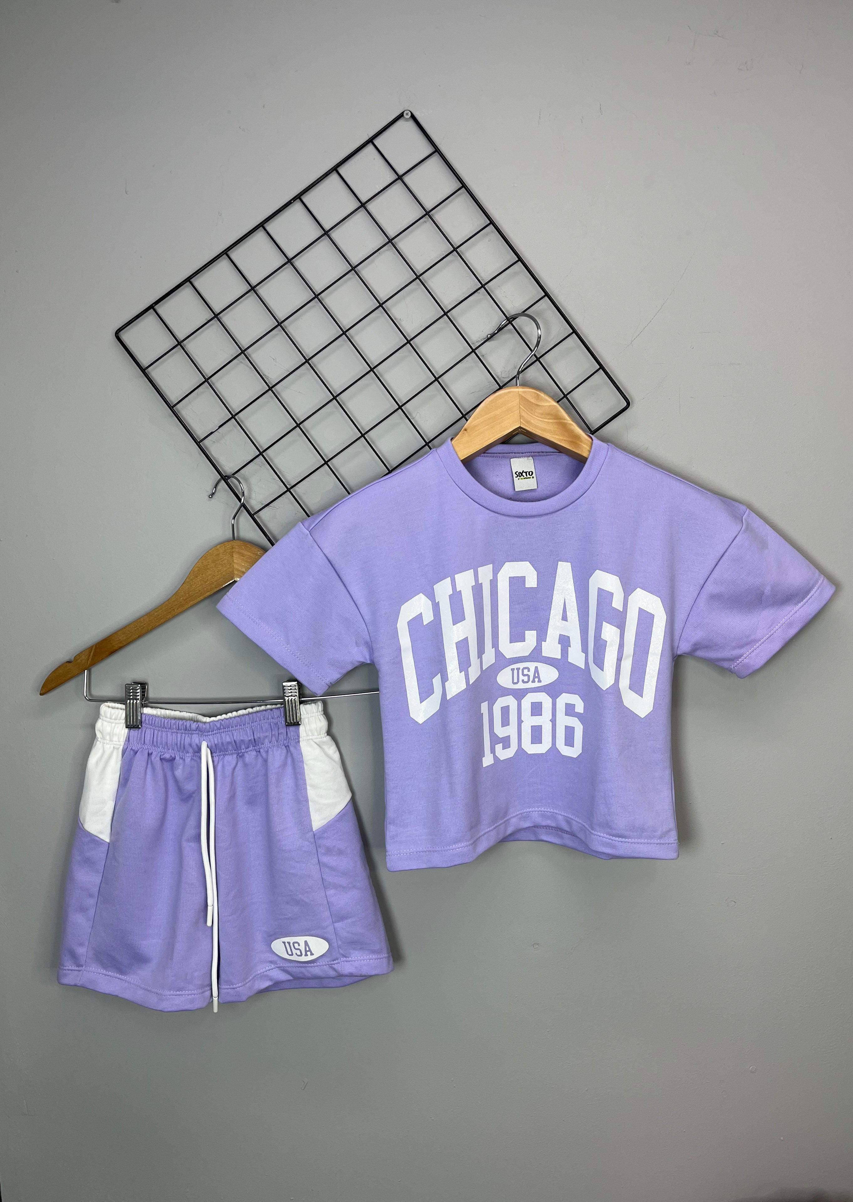 Conjunto de niña de short y camiseta tipo croptop con estampado color lila