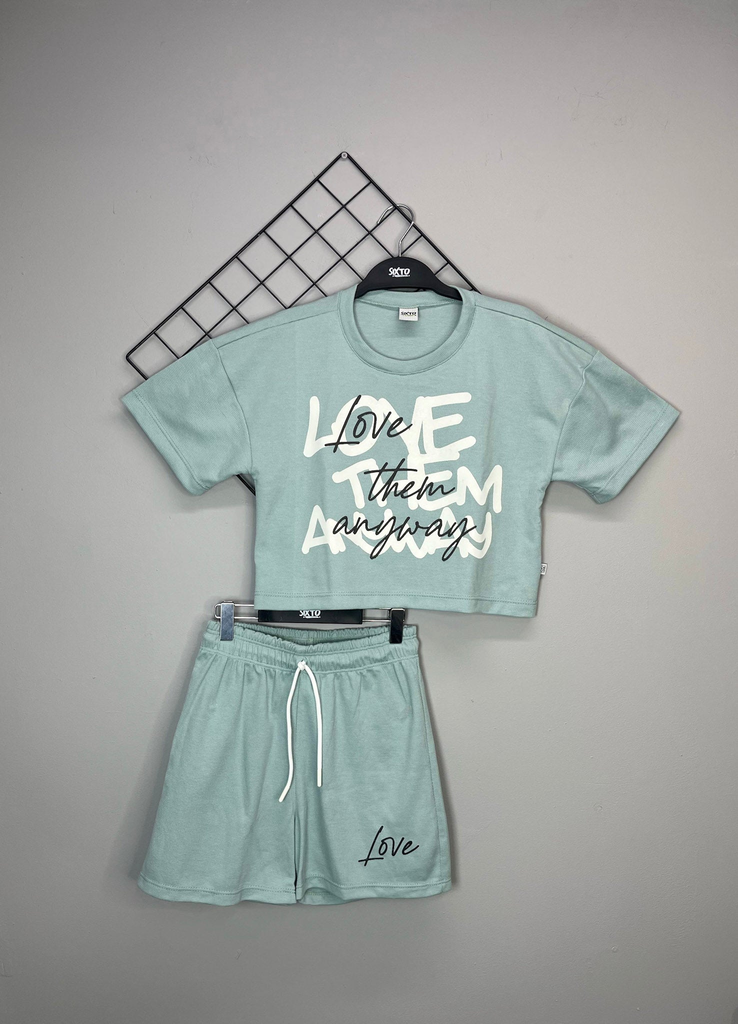 Conjunto de niña de short y camiseta manga corta con estampado color verde claro