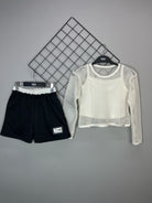 conjunto para niña top tipo malla de manga larga y un short color negro