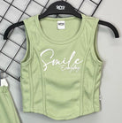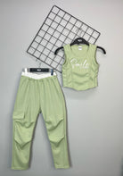 Conjunto de niña de dos piezas con un diseño moderno. Incluye un crop top sin mangas con estampado inspirador y un pantalón cargo con cintura elástica y bolsillo lateral. ¡Comodidad y estilo en una sola prenda!