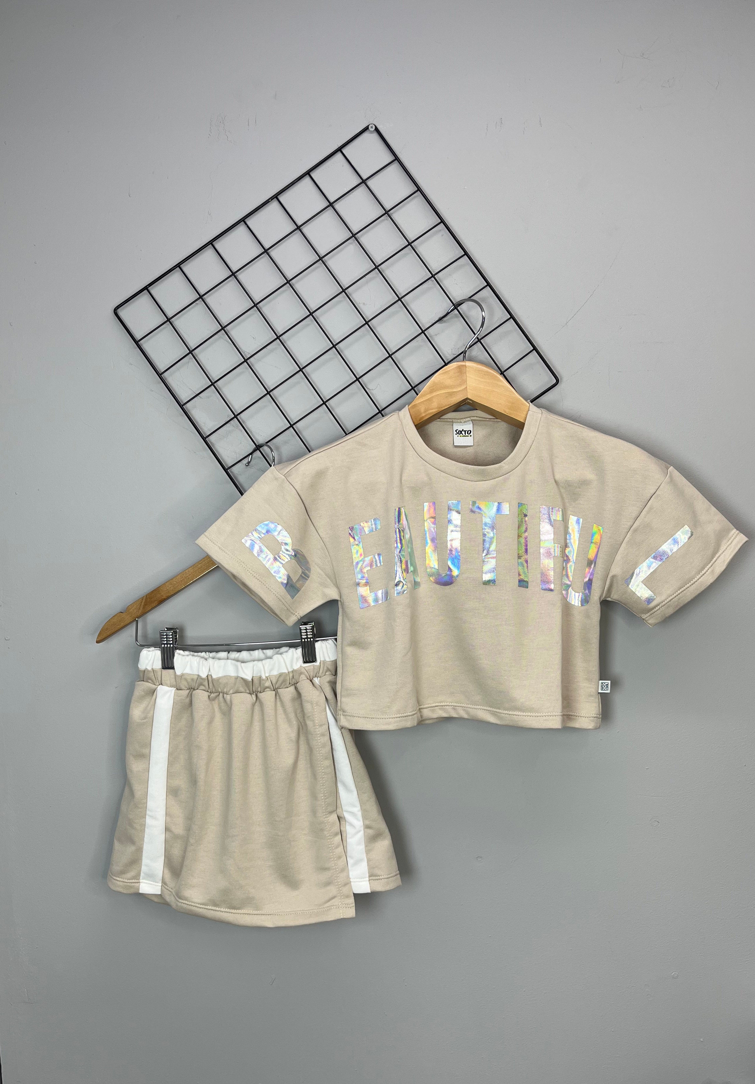 Conjunto para niña compuesto por camiseta tipo crop con estampado brillante en el frente y en las mangas, y falda short con pretina elástica y franjas laterales. Una opción cómoda y moderna para días activos, salidas o looks casuales con estilo.